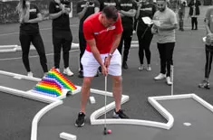 Since completion the pyramid has been a big success, entertaining at dozens of corporate events, weddings and even TV shows! Incredibly it also has amassed over 1 million views on YouTube as part of #SKYSportsDay with F2Freestylers. Contact us to hire this unique crazy golf obstacle together with our putting course for your next function.